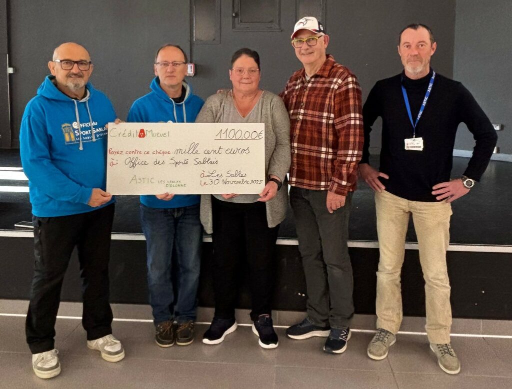 Lors de l’assemblée générale annuelle de l’ASTIC du 30 novembre, monsieur Frédéric Benelli Président Les Colibris Sport Sablais Adapté a reçu un chèque de 1100 € des mains denotre Président. Ce don représente les bénéfices du challenge caritatif de La Toussaint, organisé par l’ASTIC sur deux jours de compétition en novembre.