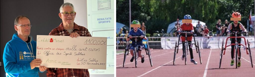 L’ASTIC, sous l’initiative de Marie PUCEL, s’était engagée à répondre à l’appel de l’Office du Sport Sablais pour favoriser l’acquisition de nouveaux matériels. Monsieur Benelli nous remercie tous chaleureusement, précisant devant l’assemblée présente que c’est la première fois qu’un club de l’agglomération répond avec tous les moyens de sa structure pour aider et encourager le handisport.