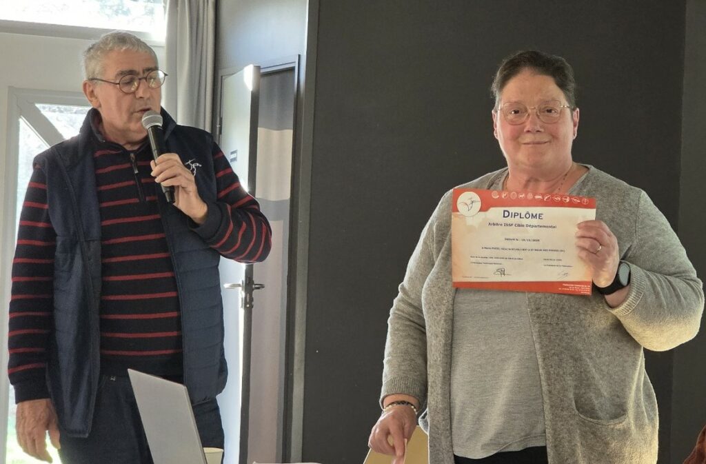 Marie reçoit ce 3 décembre 2025 sous les chaleureuses acclamations de tous les licenciés présents, son diplôme d’arbitre départementale des mains de Jean-Charles DURAND représentant de la Ligue Régionale de Tir sportif, lors de l’assemblée générale annuelle de l’ASTIC.